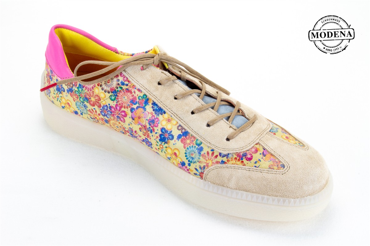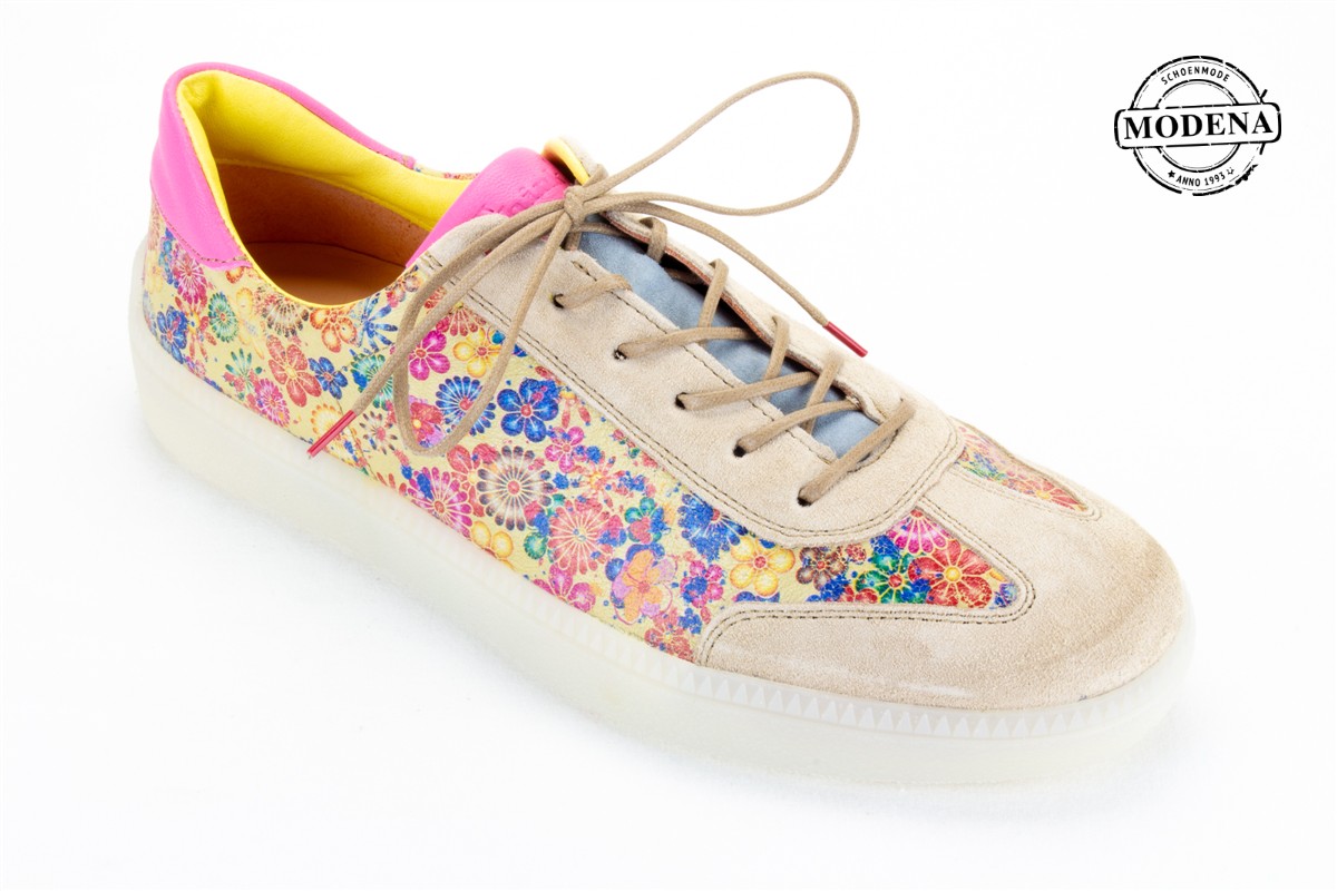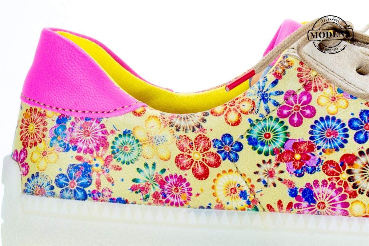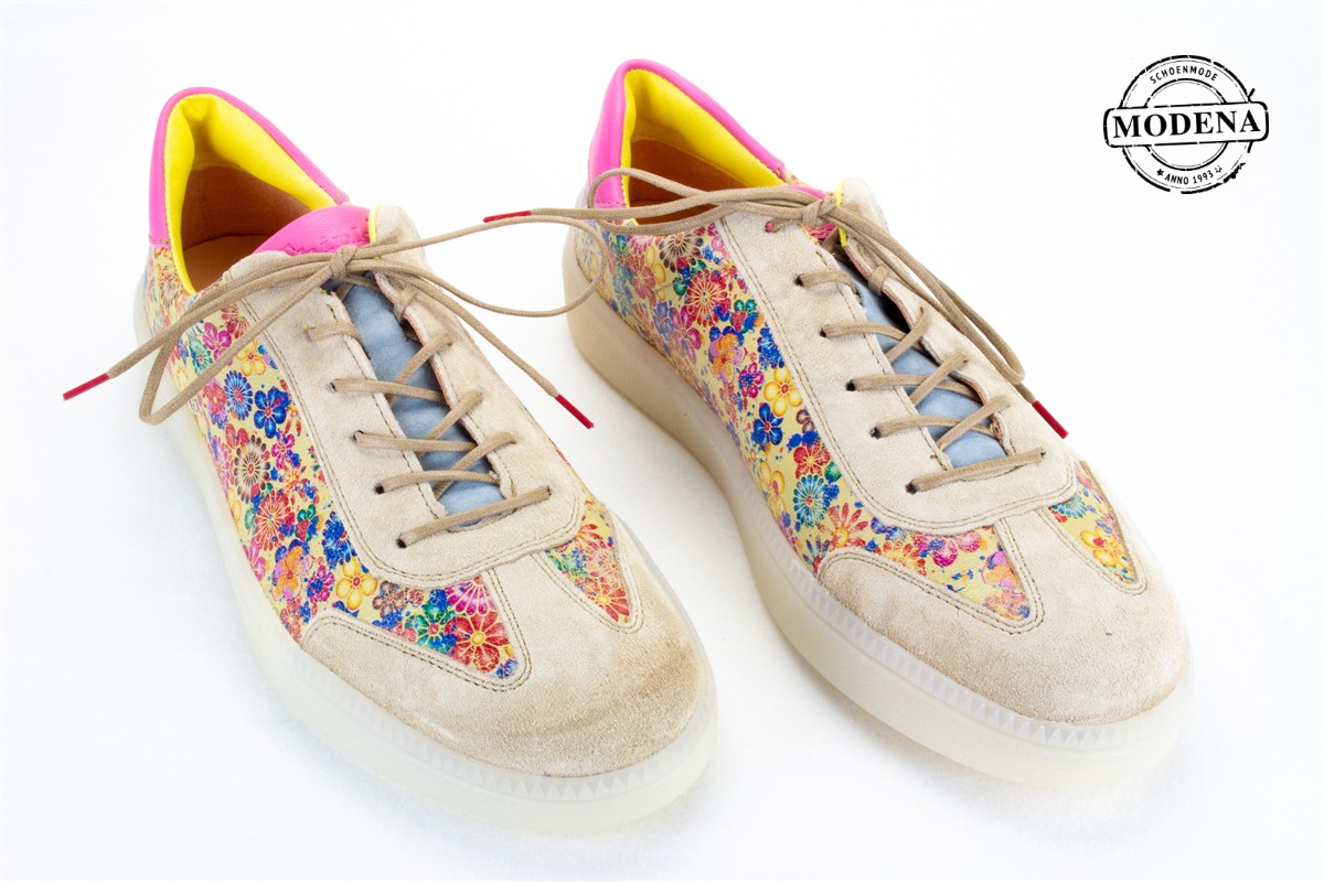 | Details | Een lage veterschoen met een geweldig leuke bloemekesprint, beige nubuck neus en een fel roze hiel-inzet. |