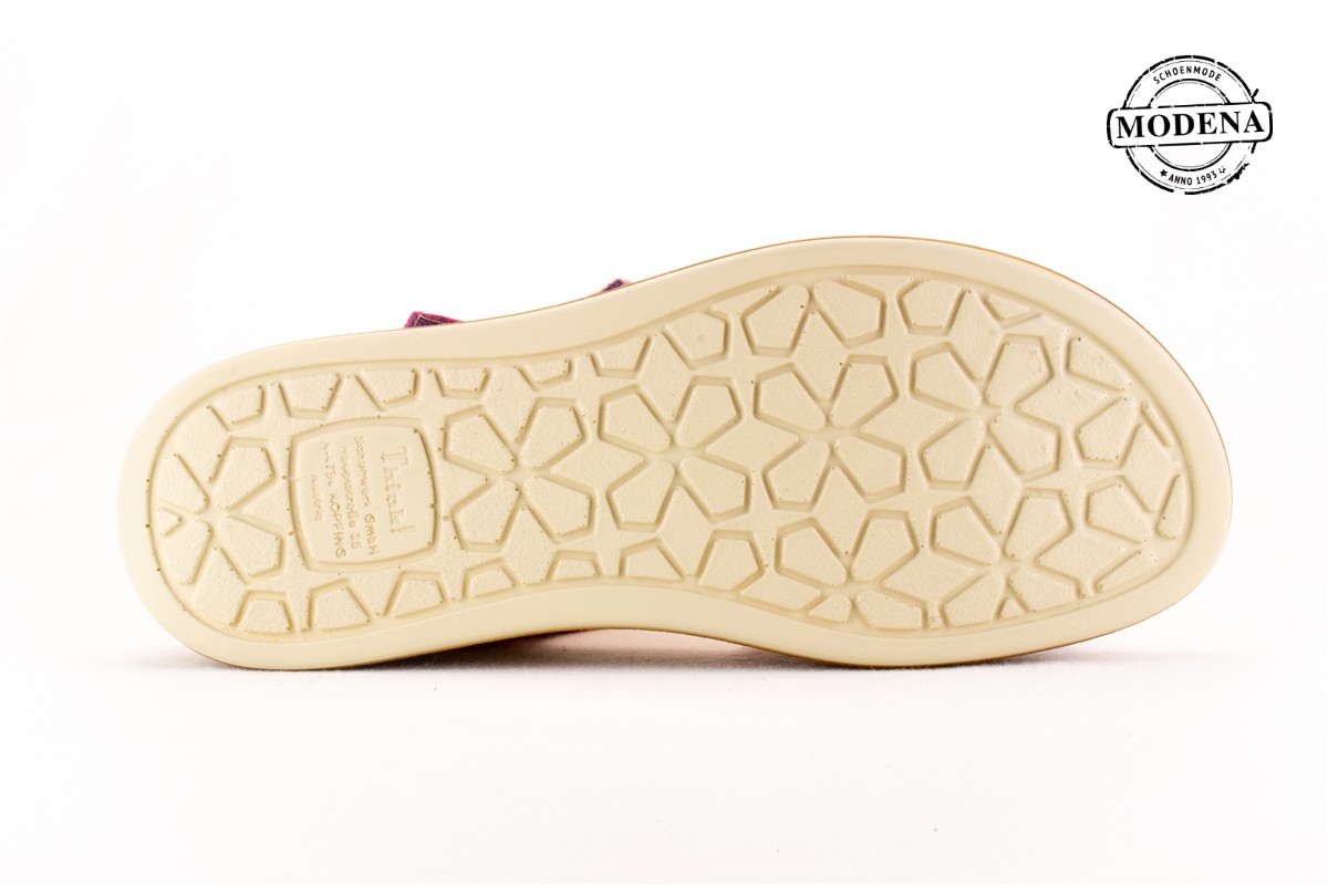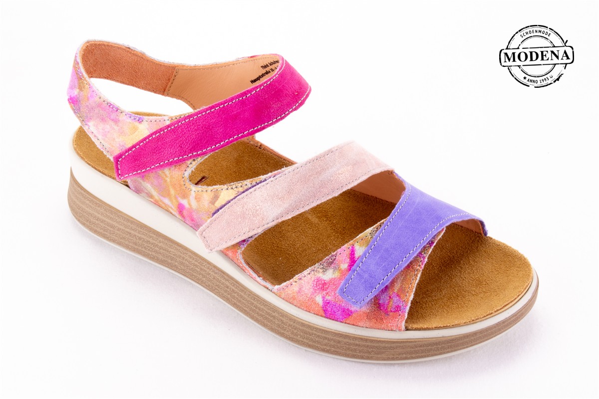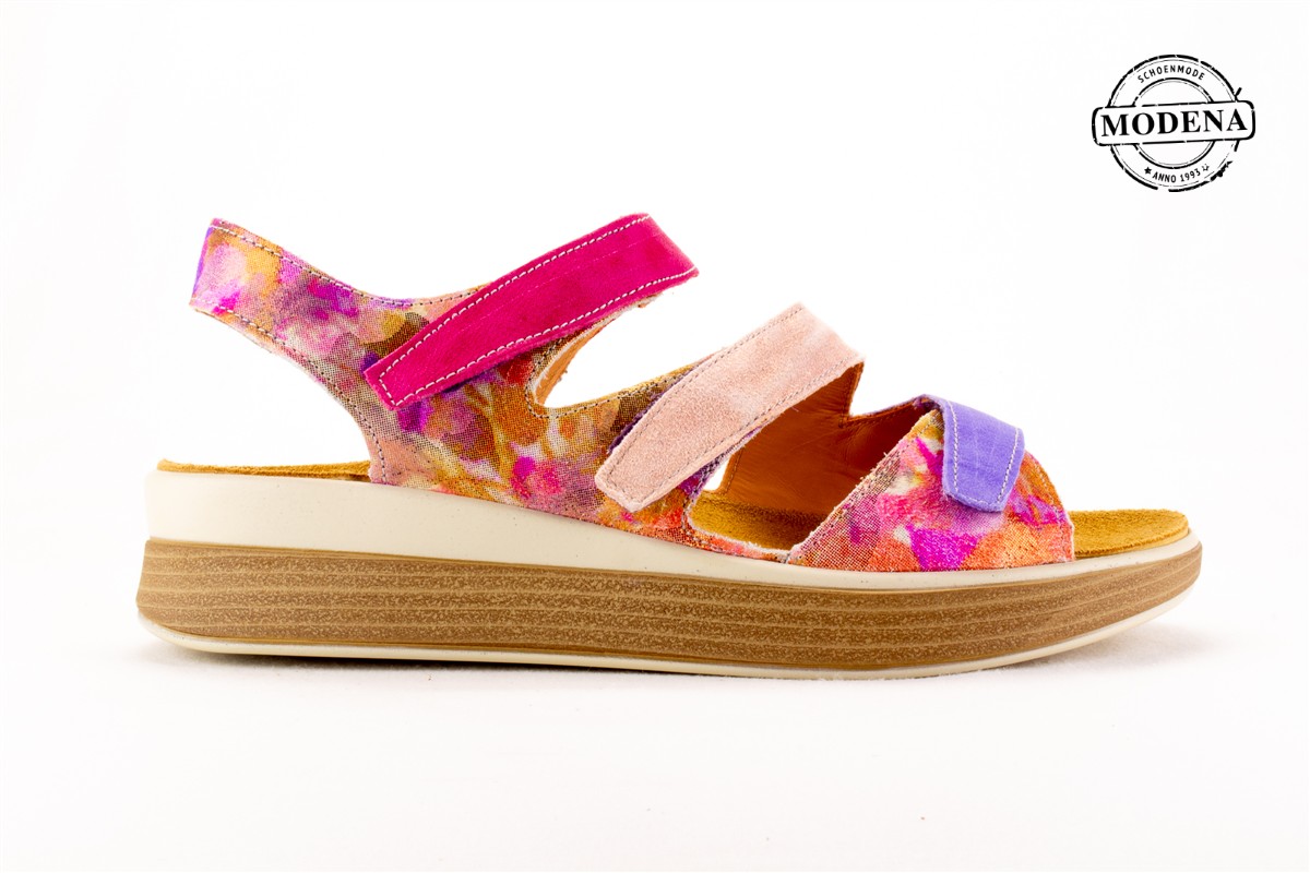 | Details | Een sandaal met 3 verstelbare banden over de voet. Met een printje in het leder op de zijkant met een matalic glansje. De riemen bovenop de voet zijn fuchsia roze, zacht roze en paars. Deze sandaal heeft een goede stevige zool. |