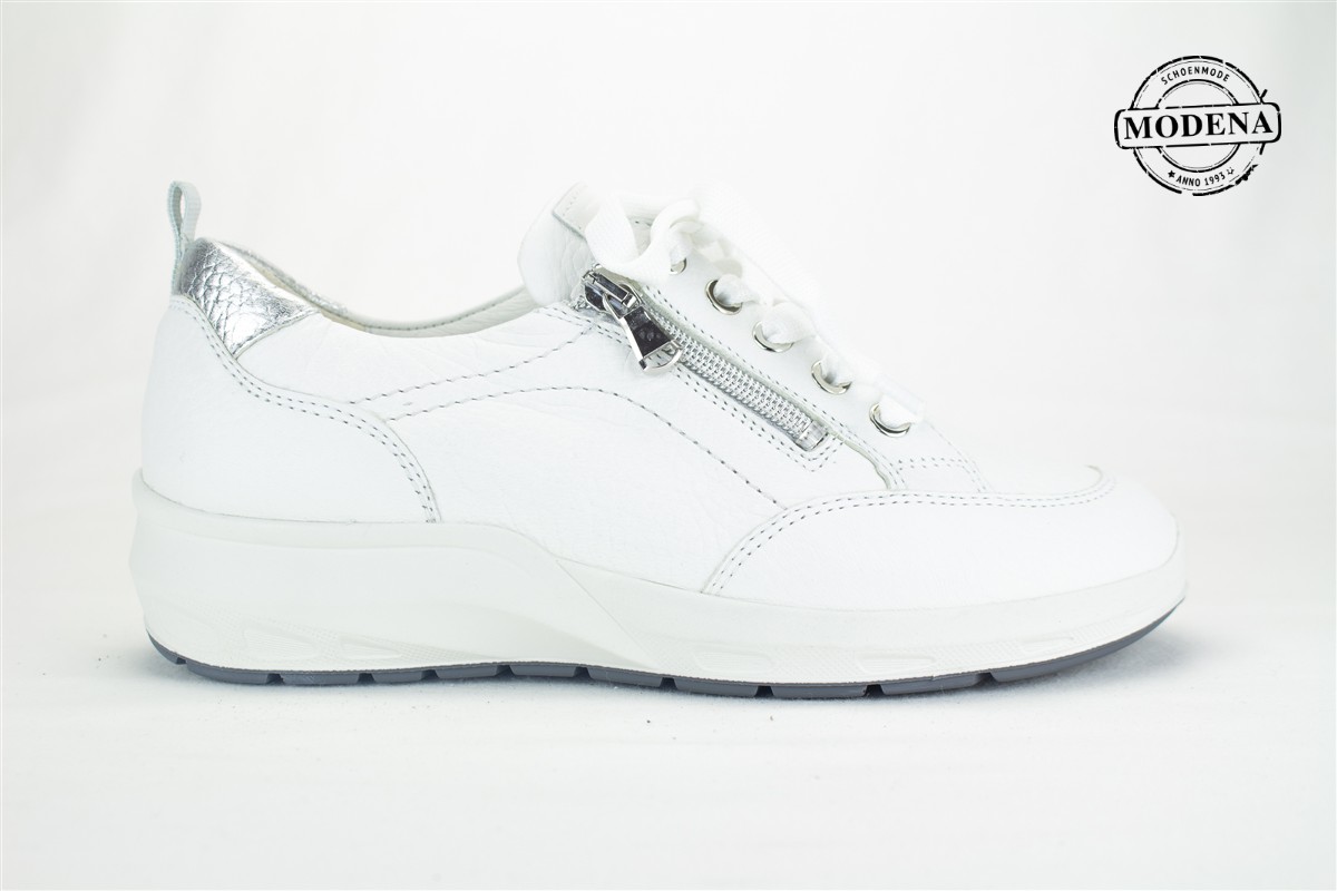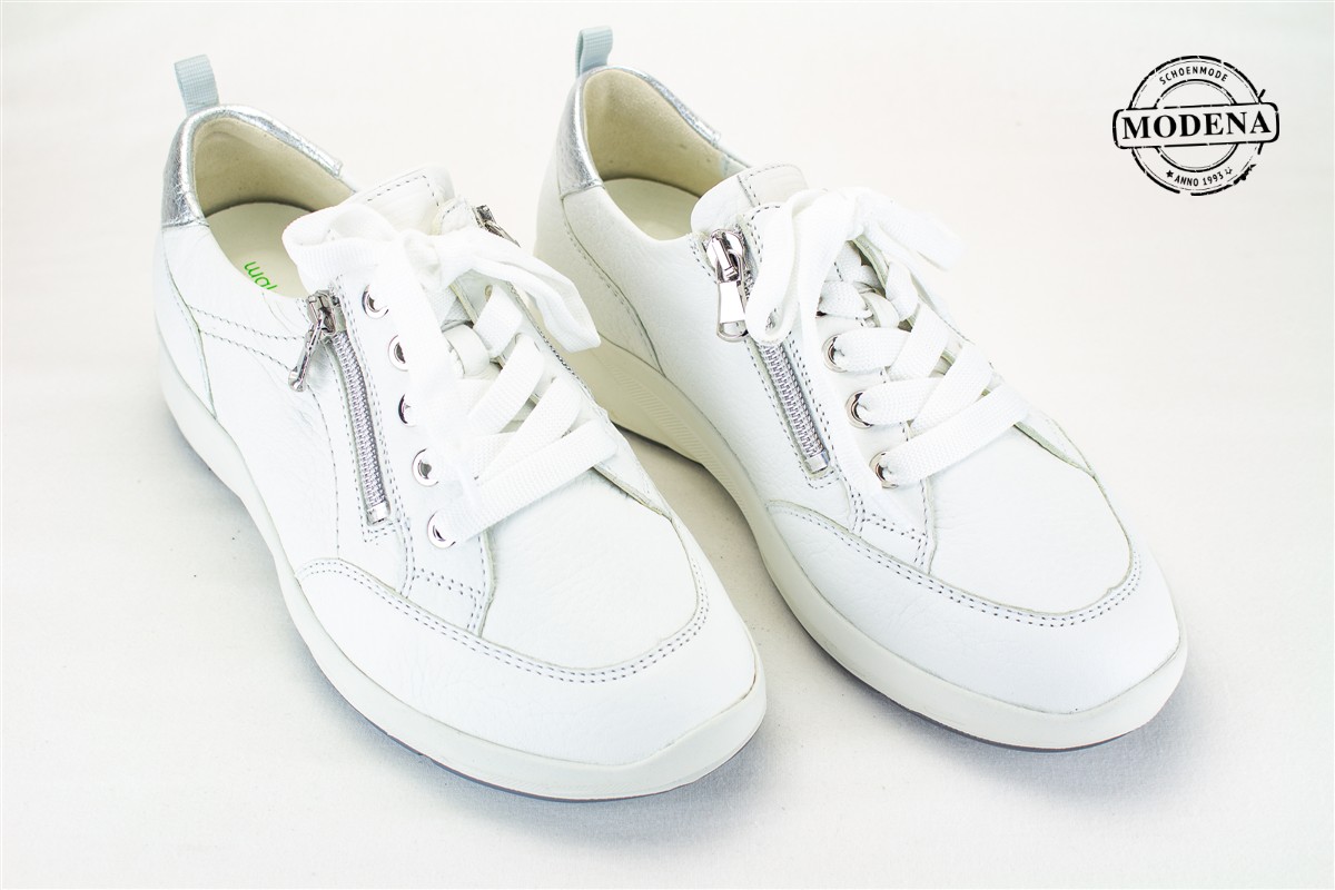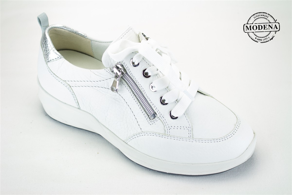 | Details | Een extra brede sneaker met veter en een rits. Met een klein zilveren accent aan de hiel. |