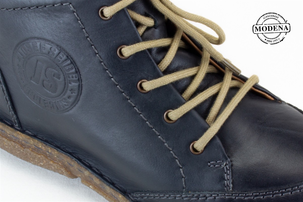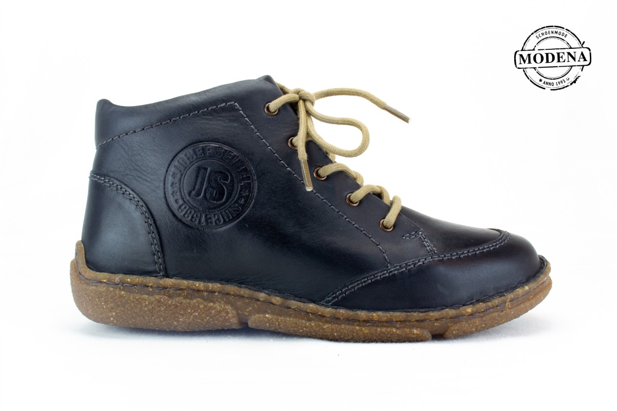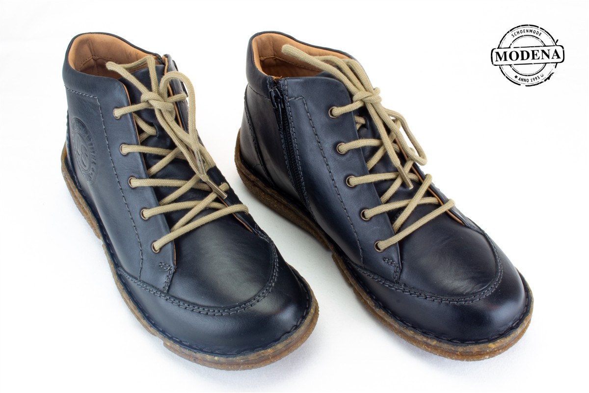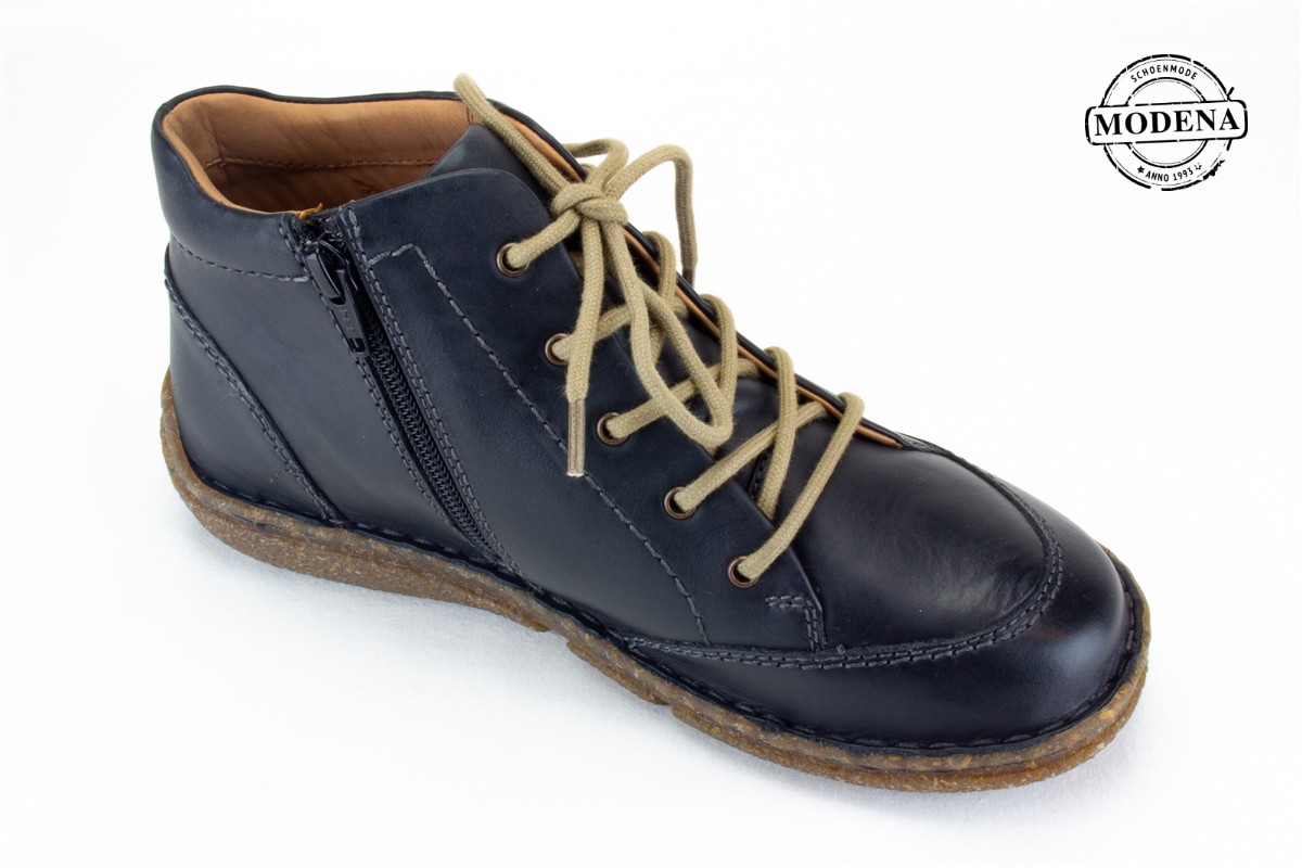 | Details | Een veterschoen tot net over de enkel. Zwart leder met sierstiksels en een lichte veter en zool. |