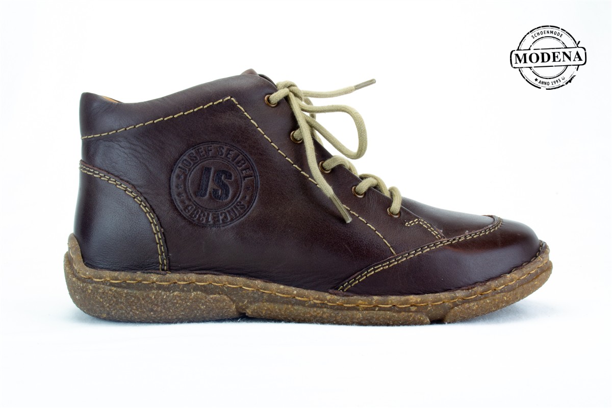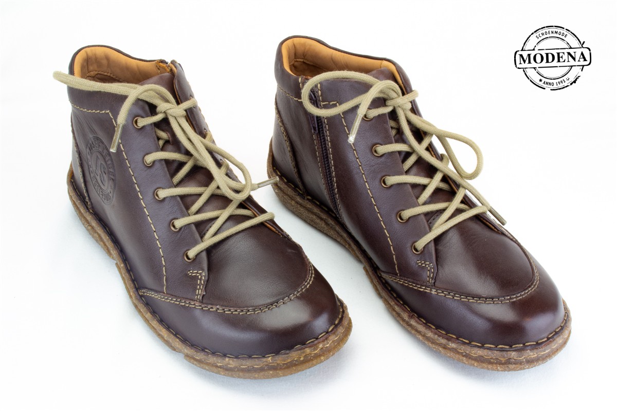 | Details | Een veterschoen tot net over de enkel. Donkerbruin leder met sierstiksels en een lichte veter en zool. |