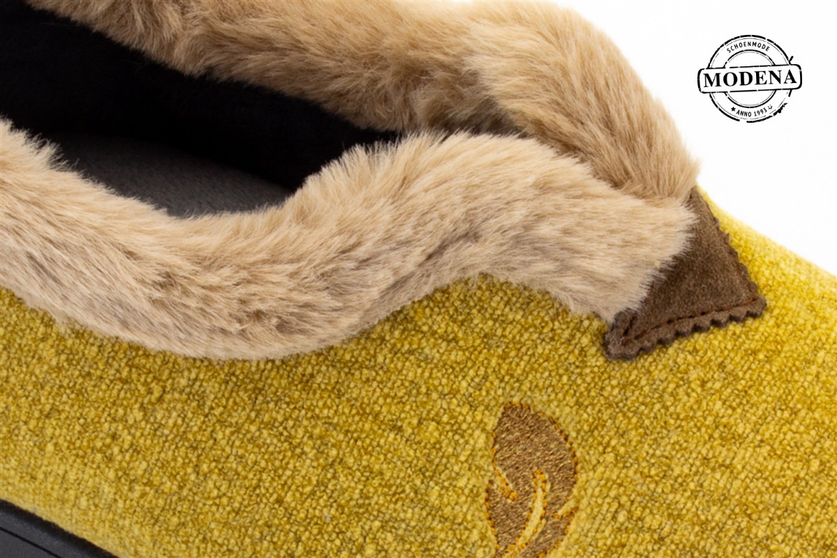| Details | Een gesloten pantoffel die vrij hoog dicht is op de wreef, afgeboord met een (nep)pelsje. |