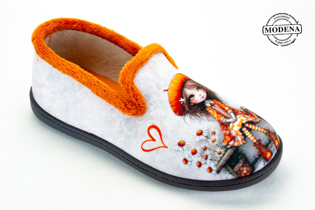 | Details | Een gesloten pantoffel met een hele mooie tekening van "meisje met baret" op de voet, links en rechts is een andere tekening. Met een oranje neppelsje langs de kant. |