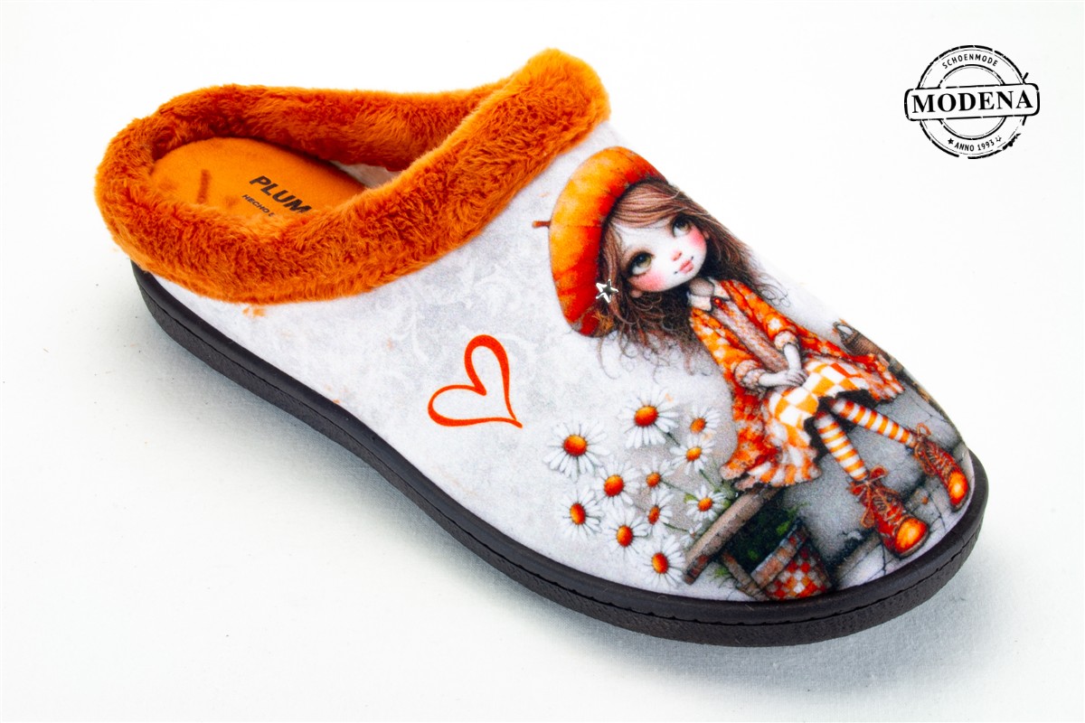 | Details | Een pantoffel met open hiel en een hele mooie tekening van "meisje met baret" op de voet, links en rechts is een andere tekening. Met een oranje neppelsje langs de kant. |