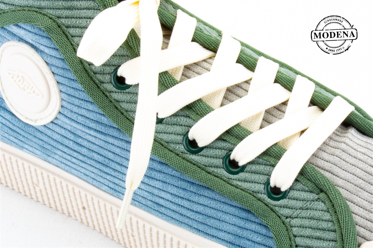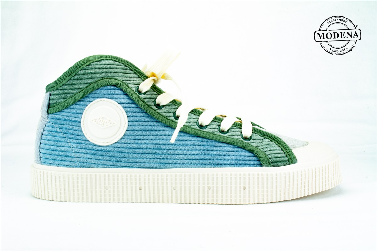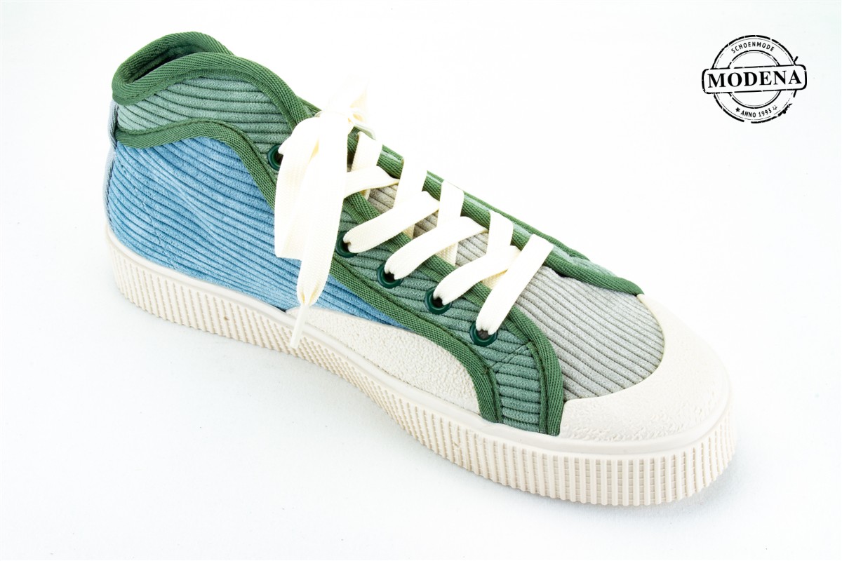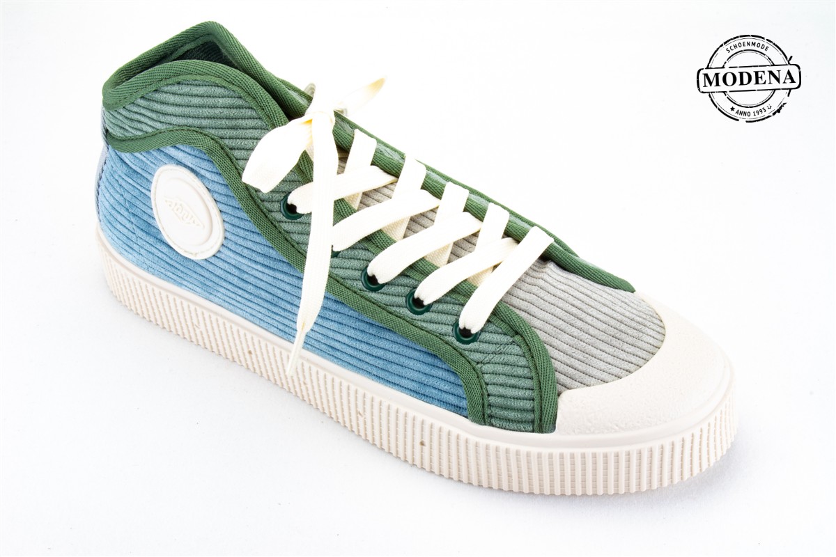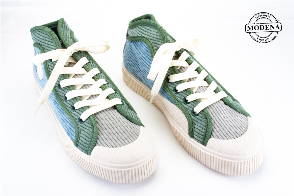| Details | Een enkelhoge basket in een kei toffe mix van blauw - groen en grijs in ribstof. De neus is een stukje overtrokken met de gummi van de zool. |