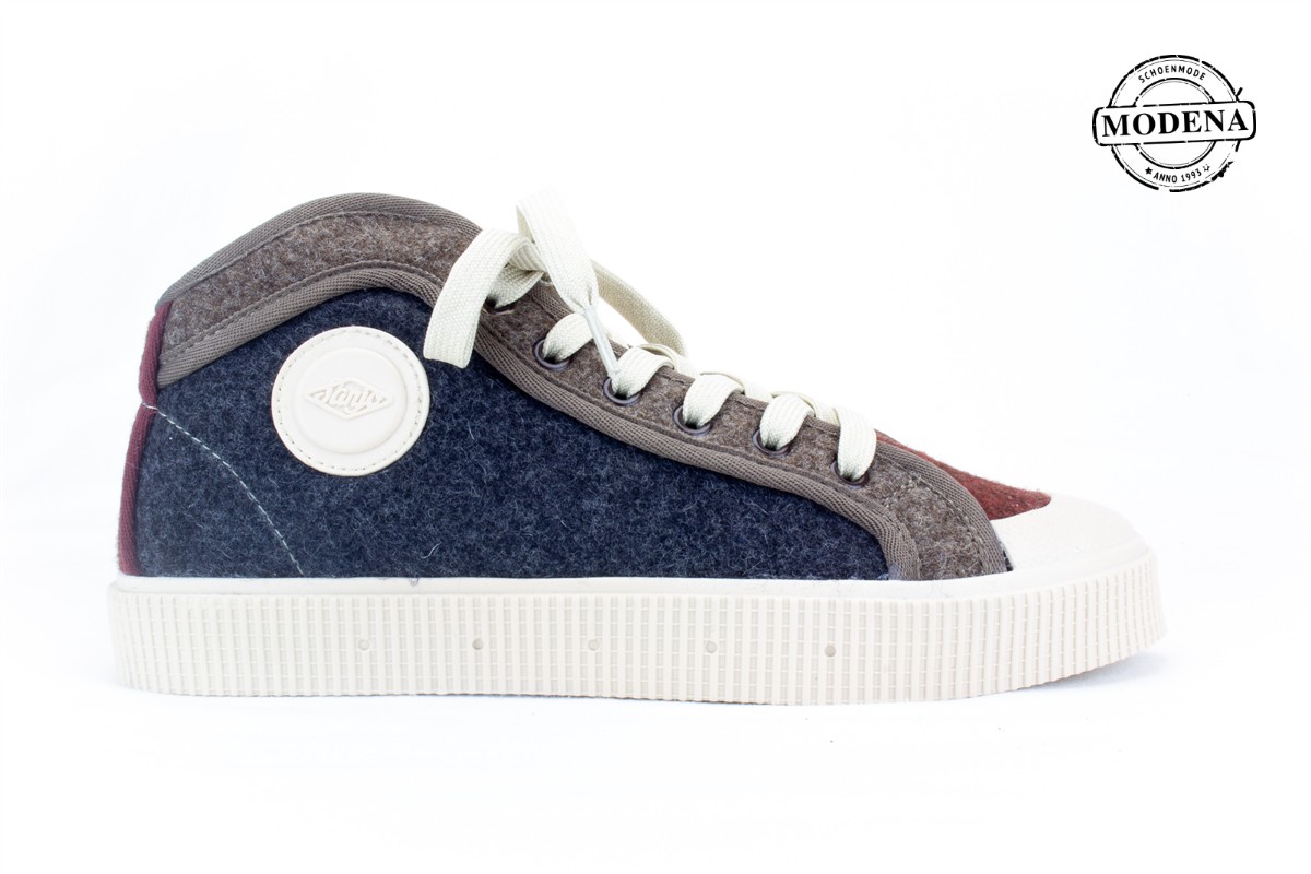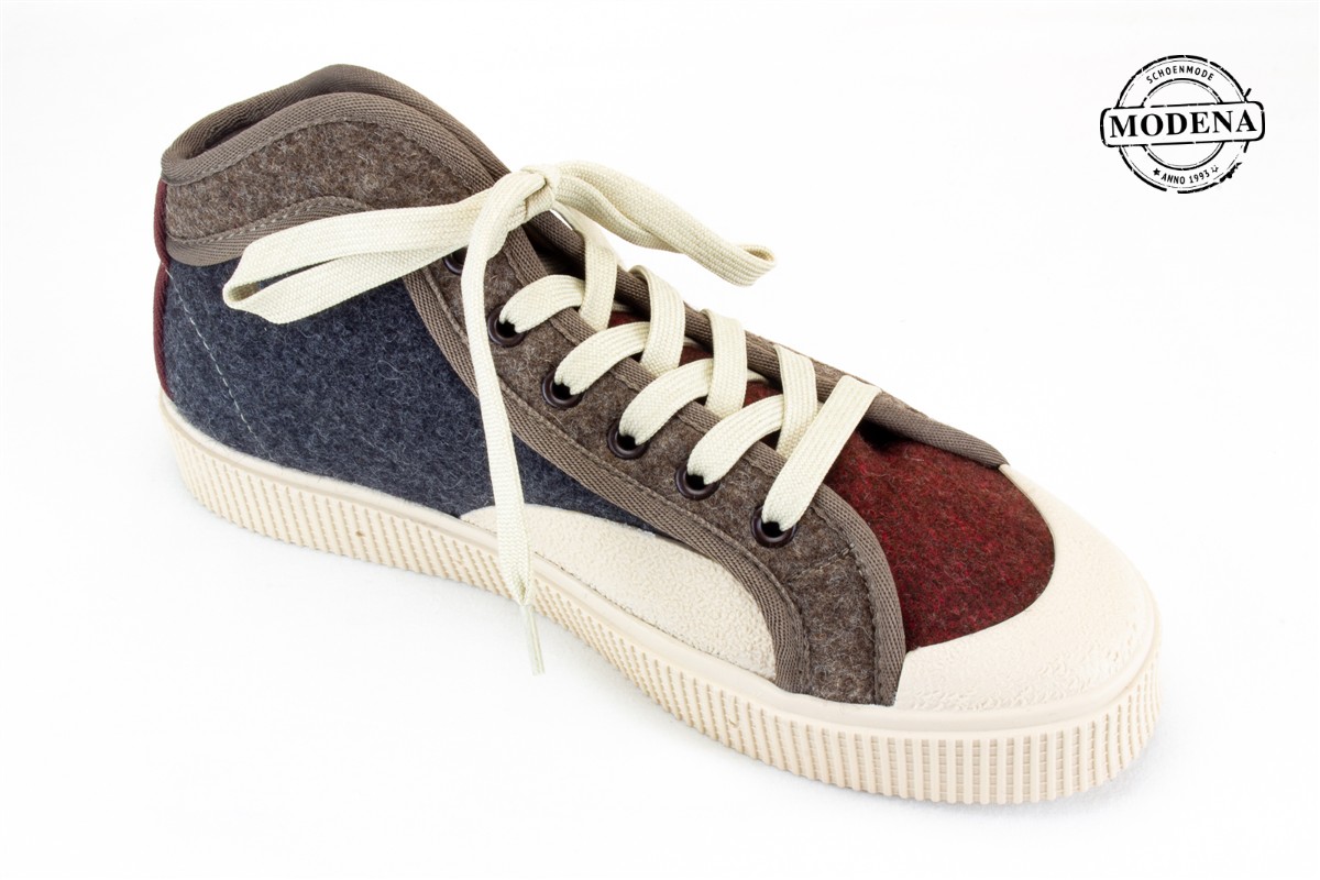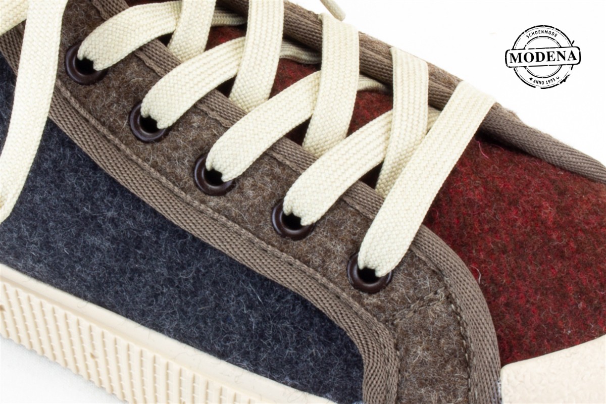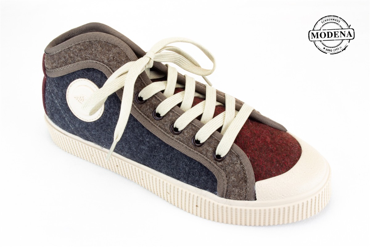 | Details | Een enkelhoge basket in een kei toffe mix van bruin - grijs en rood in vilt. De neus is een stukje overtrokken met de gummi van de zool. |