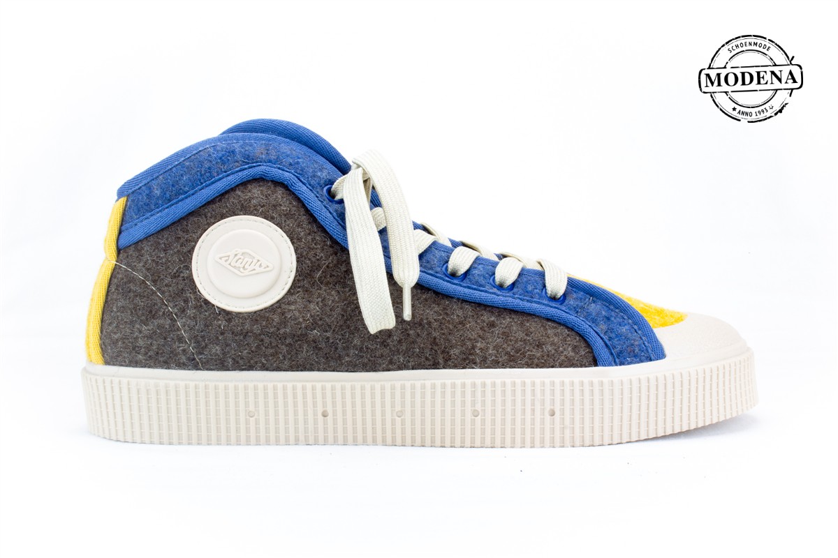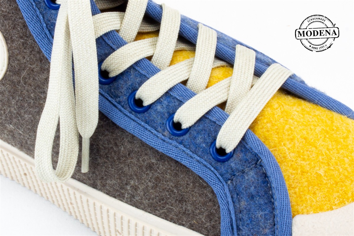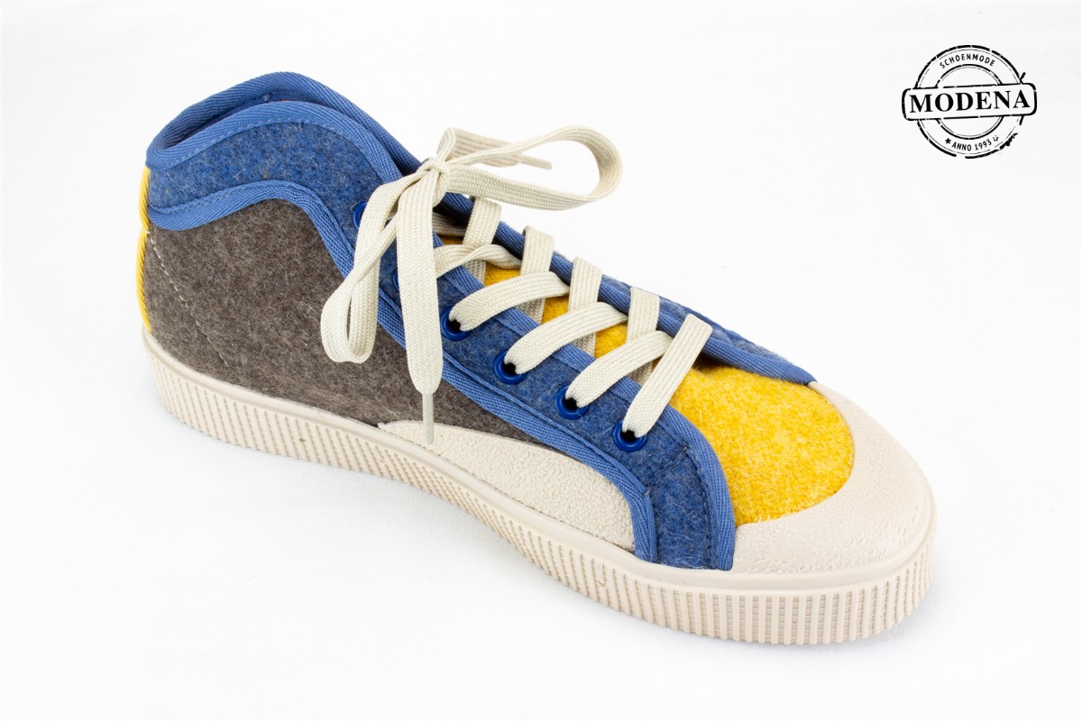 | Details | Een enkelhoge basket in een kei toffe mix van blauw - geel en grijs (taupe) in vilt. De neus is een stukje overtrokken met de gummi van de zool. |