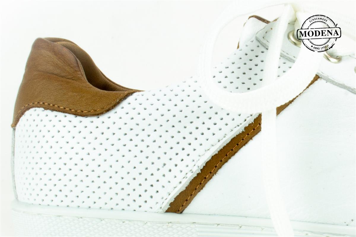 | Details | Een witte, lage basket met een camel biesje en hiel. Kleine perforeetjes in de neus en zijkanten, maar er zit wel voering onder, de perforee is niet door en door. |
