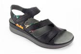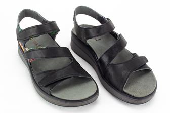 | Details | Een sandaal met 3 velcro's: effen zwart bovenop op de voet, De buiten zijkant heeft een tekening in het leder in een paar felle kleuren die aan iedere kant kunnen verschillen. |