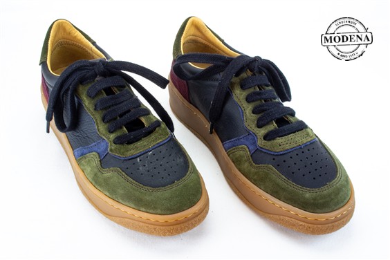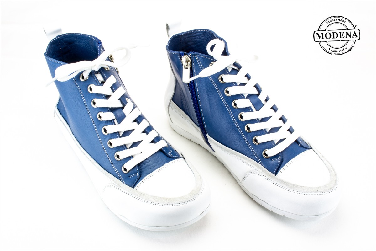 | Details | Een hoge basket met veters en een rits. Een jeansblauwe schoen met een brede witte boord langs de zool en over de neus. Goed breed en lekker zacht van leder, ook de zool is redelijk flexibel. |