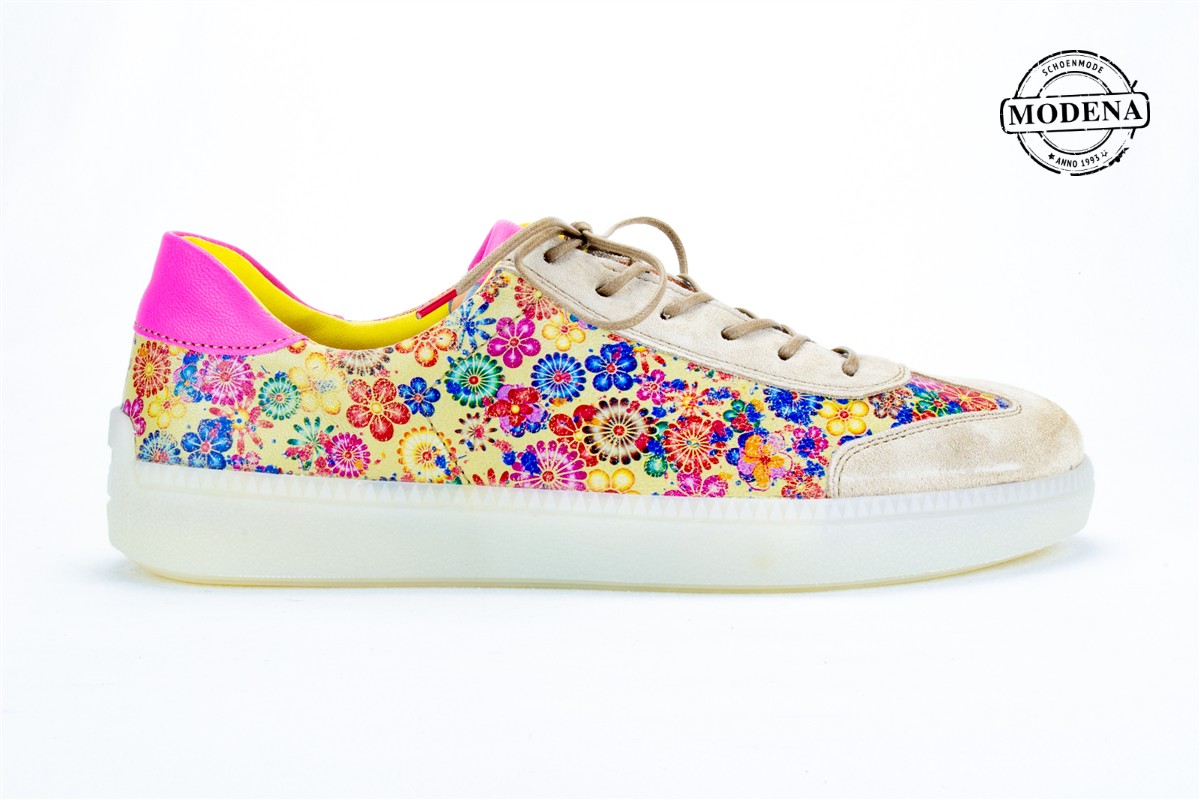 | Details | Een lage veterschoen met een geweldig leuke bloemekesprint, beige nubuck neus en een fel roze hiel-inzet. |