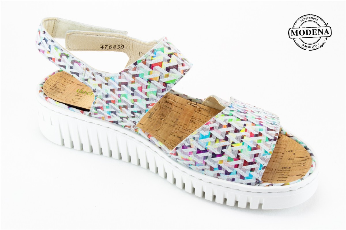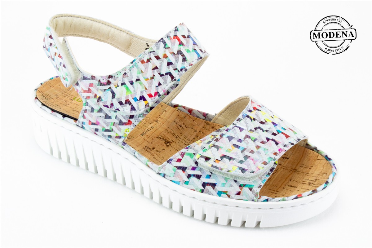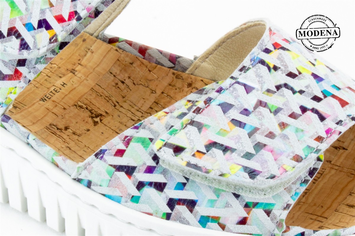| Details | Een sandaal met 2 verstelbare banden over de voet, alsook het riempje van de hiel. Een hele kleurrijke ondergrond getemperd met een beetje wit erover. de zool loopt iets omhoog zonder een echte hak te zijn. |