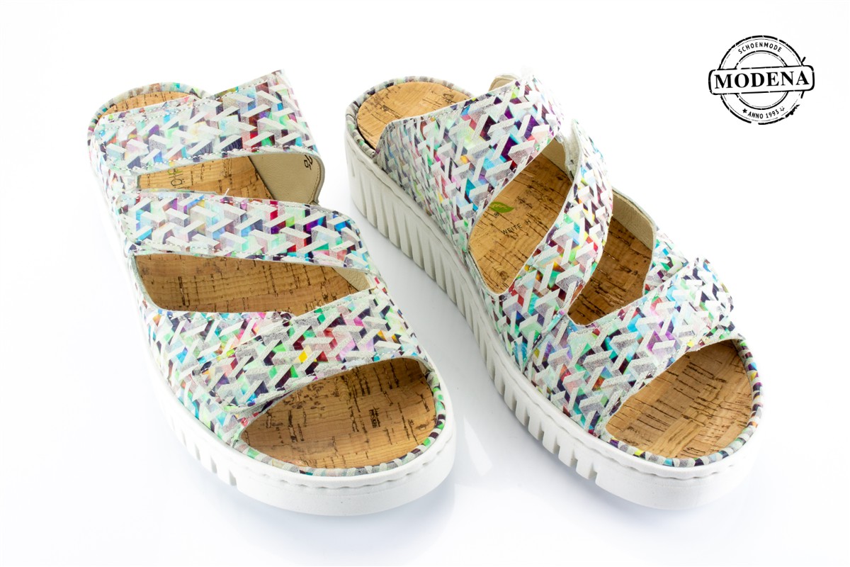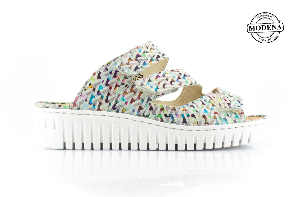 | Details | Een slipper met 3 verstelbare banden over de voet. Een hele kleurrijke ondergrond getemperd met een beetje wit erover. De zool loopt iets omhoog zonder een echte hak te zijn. |