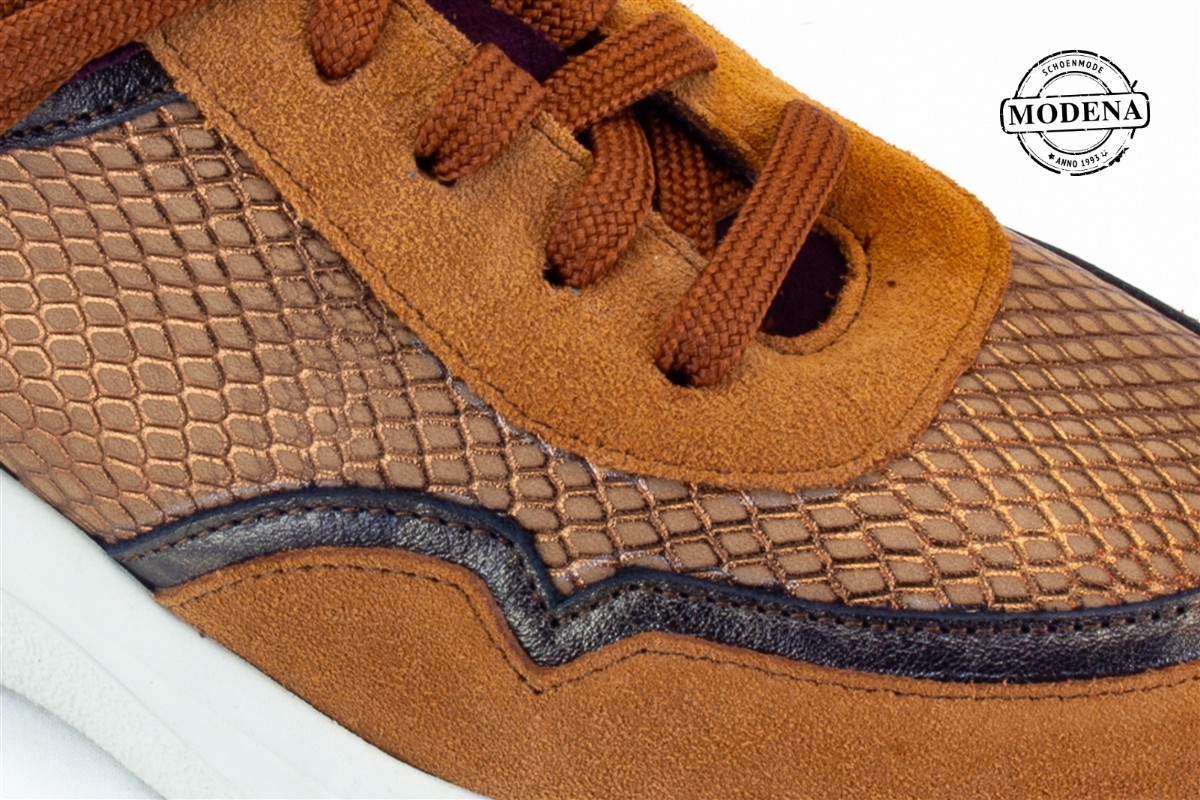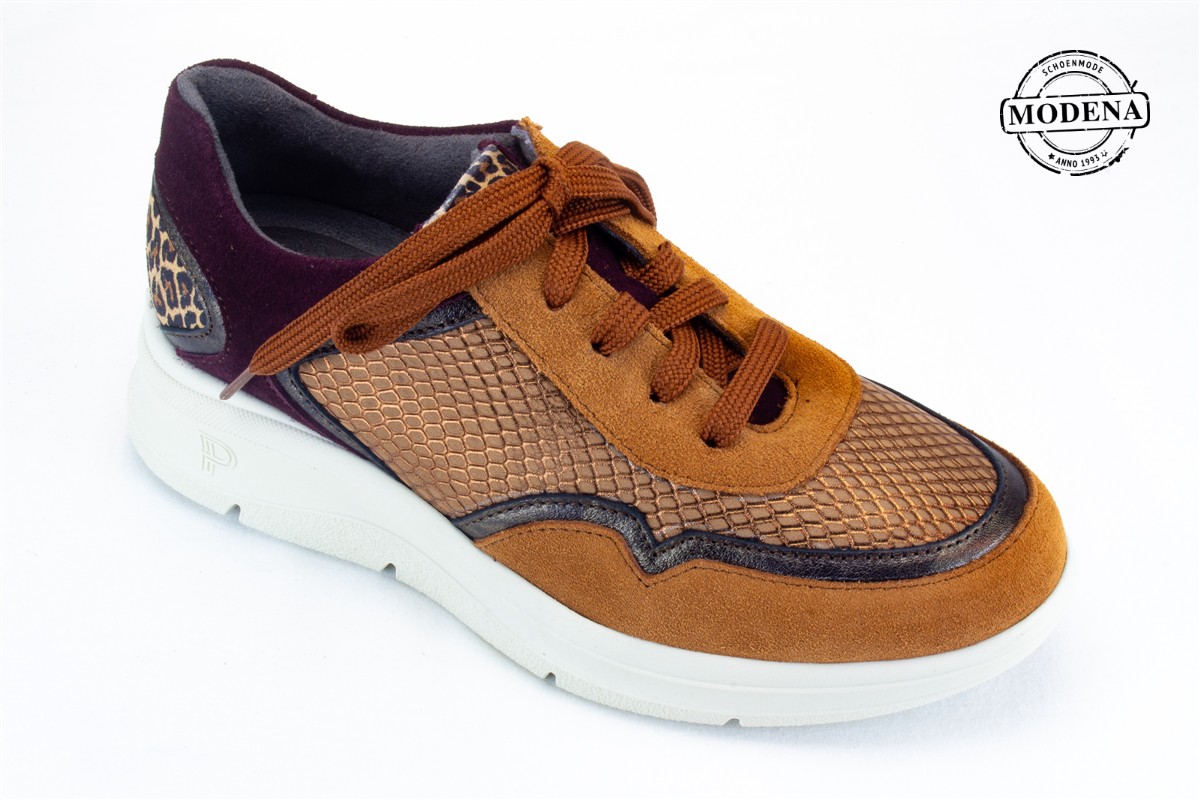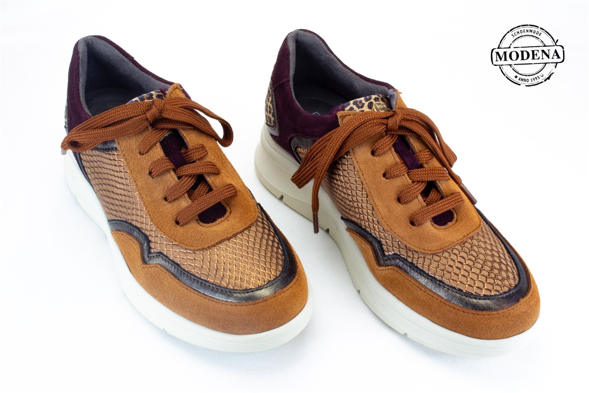 | Details | Een luchte en toch stevige sneaker, in een combinatie van cognac met bordo en brons en een kleine inzet van luipaard print. |