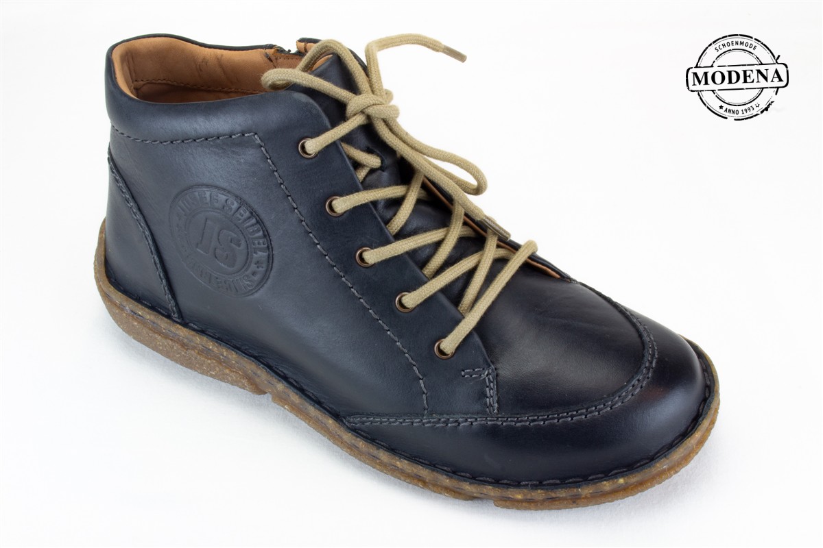 | Details | Een veterschoen tot net over de enkel. Zwart leder met sierstiksels en een lichte veter en zool. |