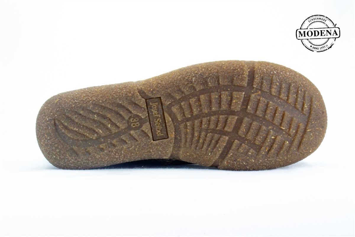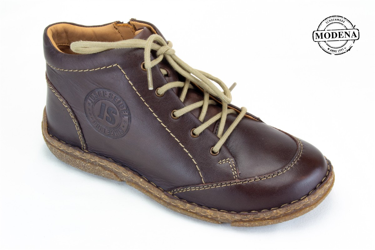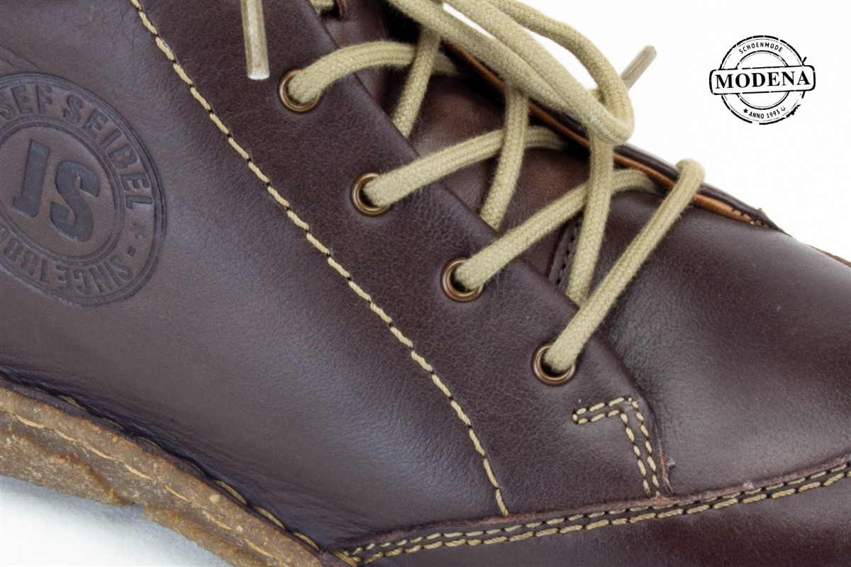 | Details | Een veterschoen tot net over de enkel. Donkerbruin leder met sierstiksels en een lichte veter en zool. |