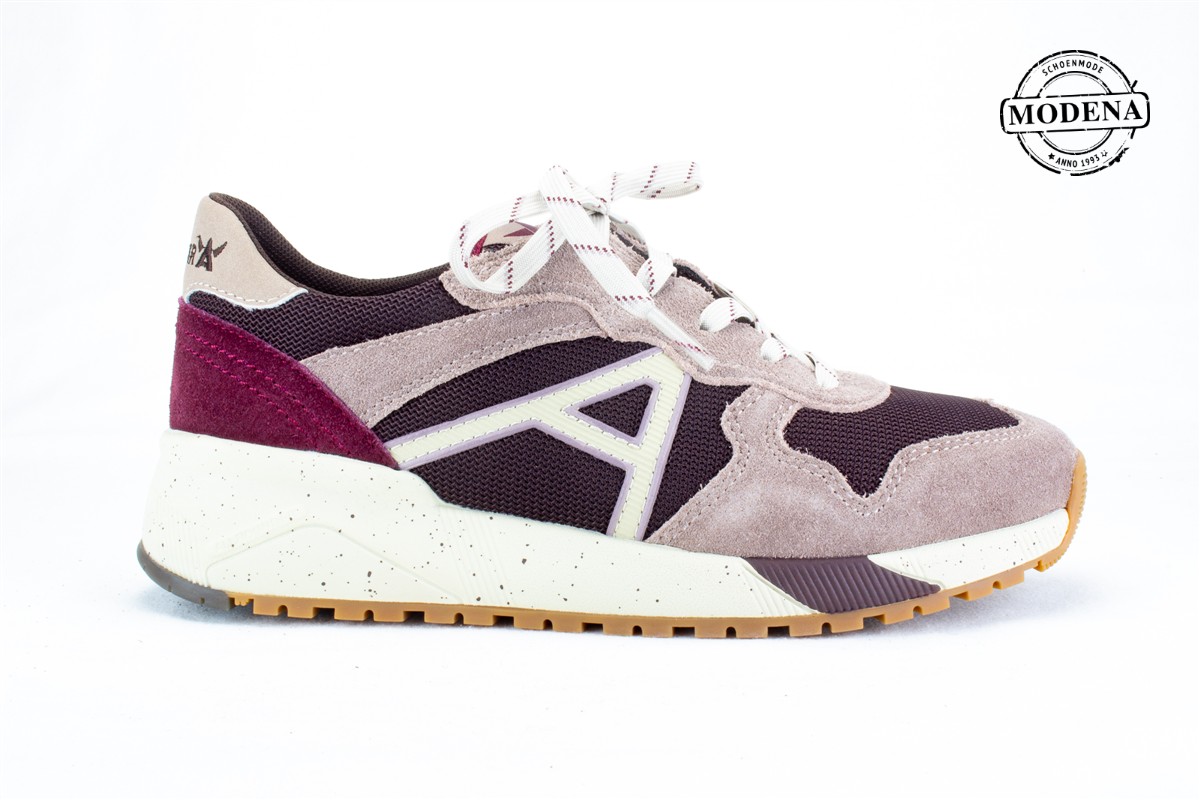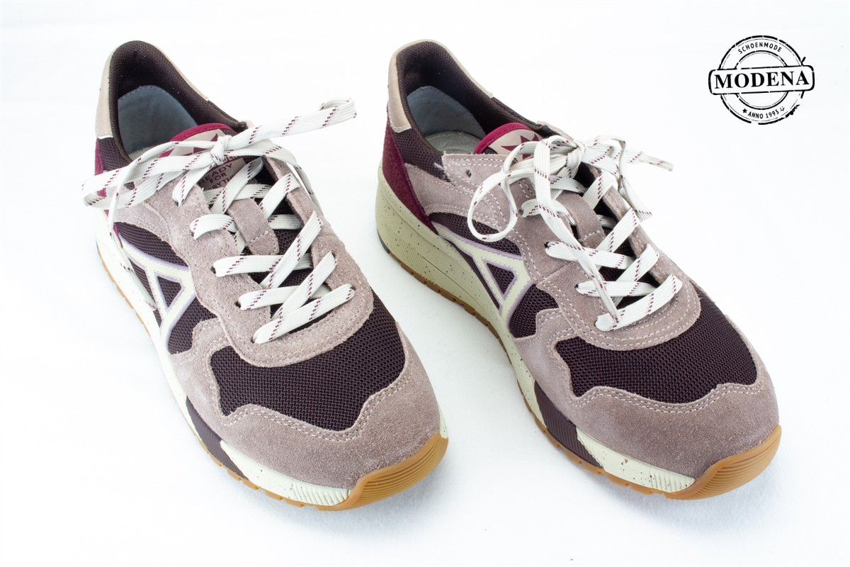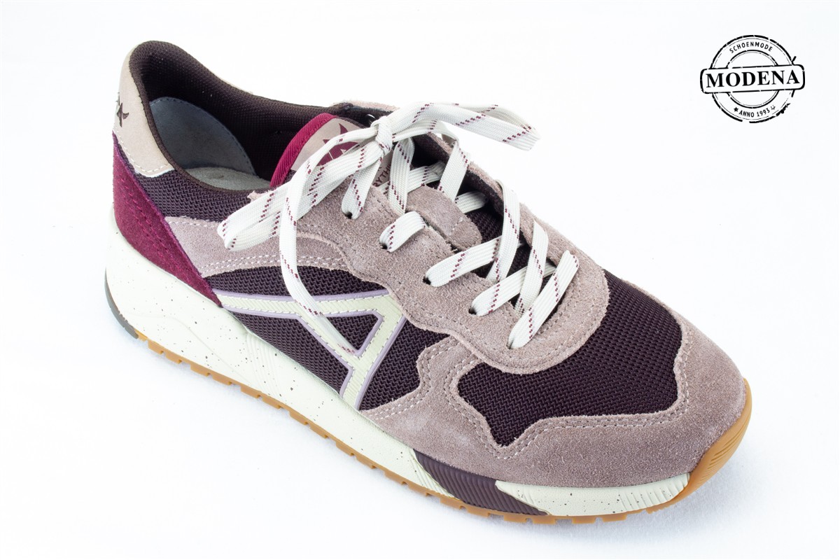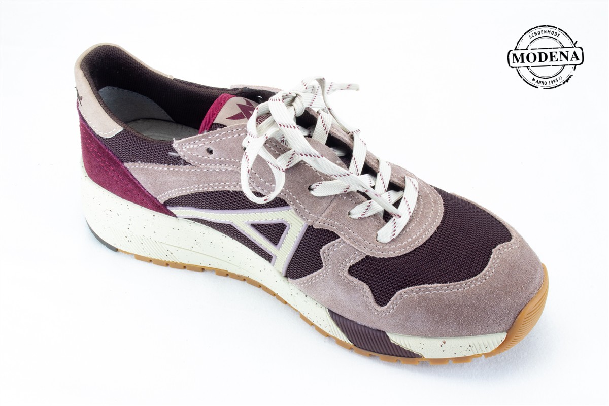 | Details | Een sneaker met een mix van zacht oudroze, bordo en donkerbruin en daarbij dan een beige zool en veter. met een zeer stevige zool. |