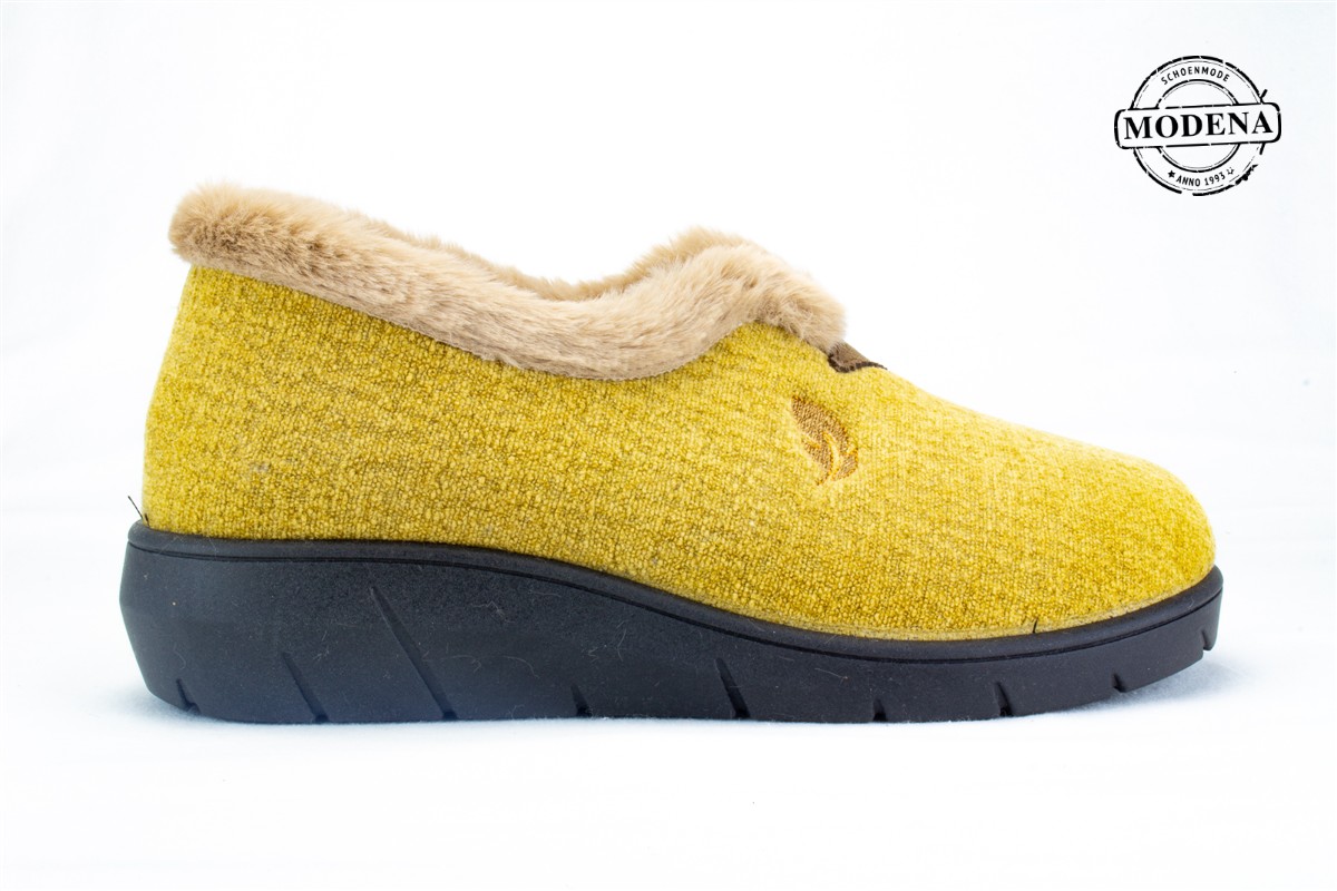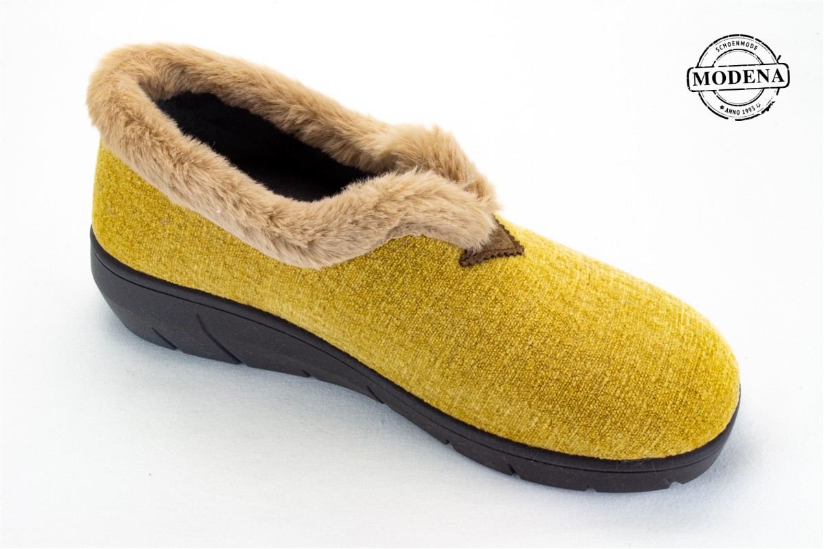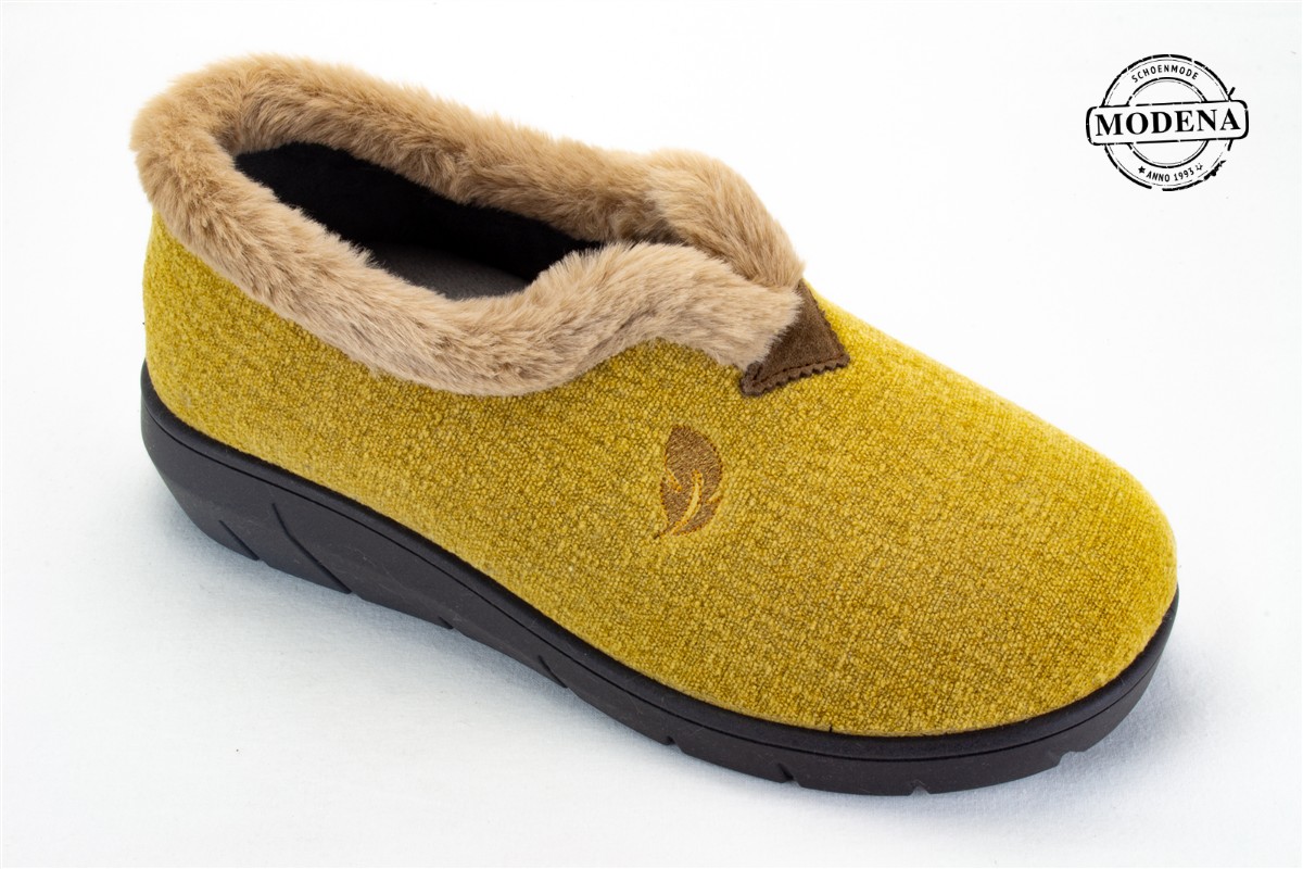| Details | Een gesloten pantoffel die vrij hoog dicht is op de wreef, afgeboord met een (nep)pelsje. |