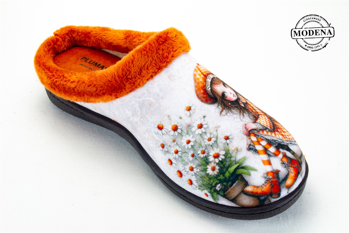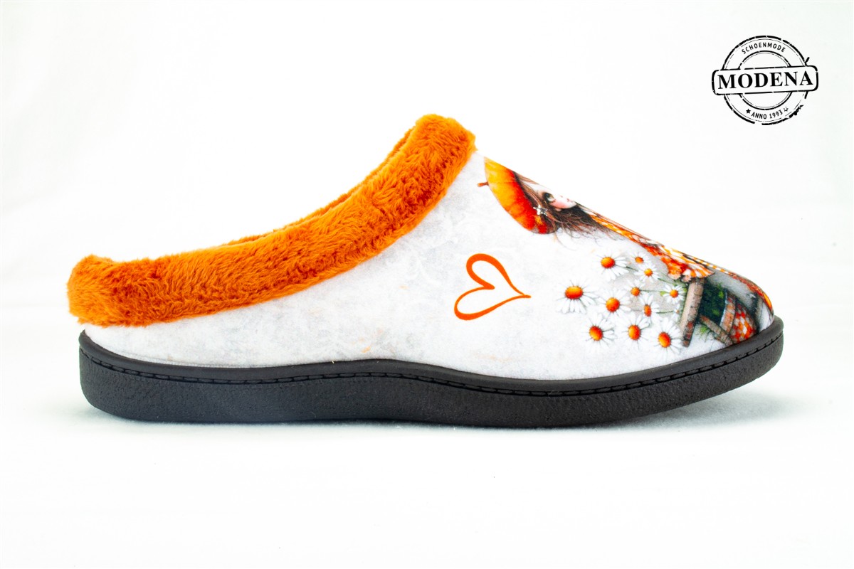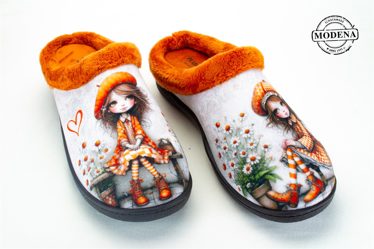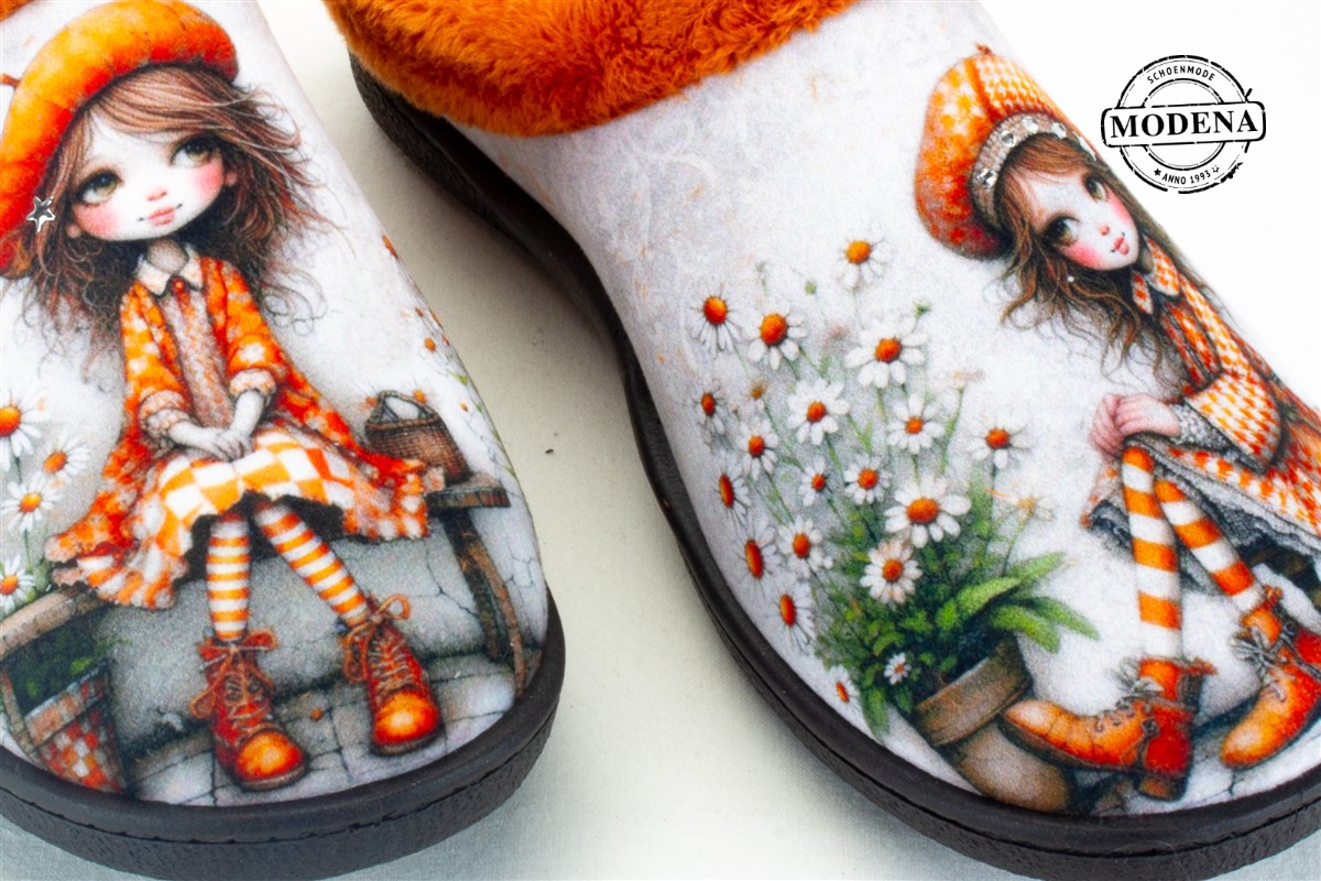 | Details | Een pantoffel met open hiel en een hele mooie tekening van "meisje met baret" op de voet, links en rechts is een andere tekening. Met een oranje neppelsje langs de kant. |
