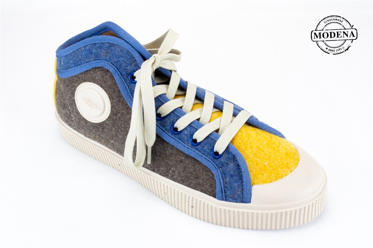| Details | Een enkelhoge basket in een kei toffe mix van blauw - geel en grijs (taupe) in vilt. De neus is een stukje overtrokken met de gummi van de zool. |